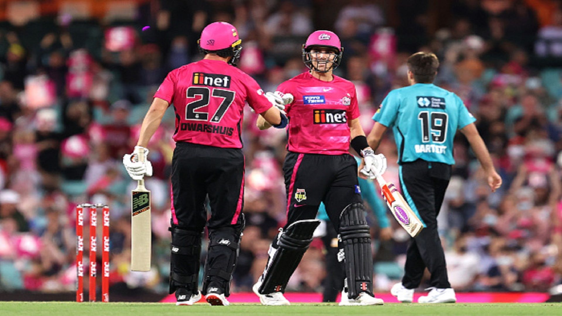 जवाब में सिडनी सिक्सर्स की शुरुआत तो बेहद ही खराब रही और जब टीम का खाता तक नहीं खुला था तभी दो विकेट गिर चुके थे. एक के बाद एक विकेटों के पतझड़ के बाद 47 रनों तक आते-आते टीम के आठ विकेट गिर गए. यहीं से सीन एबॉट और बेन ड्वारशुइस ने बल्ले से भी जिम्मेदारी उठाई और नौवें विकेट के लिए 59 रनों की मैच विजयी साझेदारी कर डाली. एबॉट ने 43 गेंदों की अपनी पारी में 2 चौकों और 2 छक्कों की मदद से 37 रन बनाए तो बेन 20 गेंदों पर तीन चौकों की मदद से 23 रन बनाकर नाबाद लौटे. आखिरी ओवर में जीत के लिए सिर्फ दो रनों की जरूरत थी, लेकिन पहली गेंद डॉट रहने के बाद दूसरी गेंद पर सिंगल आया. इसके बाद अगली तीन गेंद डॉट रहीं, लेकिन अंत में आखिरी गेंद पर एबॉट विजयी रन बनाने में सफल रहे.