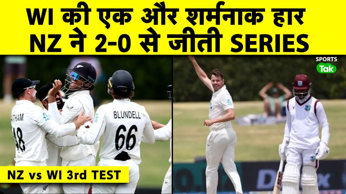 New Zealand ने West Indies को तीसरे टेस्ट में 323 रनों से हराकर सीरीज 2-0 से अपने नाम कर ली है. Unidentified speaker ने मैच का विश्लेषण करते हुए कहा, 'जहाँ 462 रन जो कि बहुत ही मुश्किल टारगेट होता है... वहाँ पर West Indies पूरी टीम जो है 138 पर ऑल आउट हो जाती है.' कीवी गेंदबाज Jacob Duffy ने शानदार प्रदर्शन करते हुए दूसरी पारी में 5 विकेट और मैच में कुल 9 विकेट झटके. वहीं, स्पिनर Ajaz Patel ने भी 3 विकेट लेकर विंडीज बल्लेबाजों को पवेलियन भेजा. बल्लेबाजी में कप्तान Tom Latham (137) और Devon Conway (227) ने पहली पारी में शतक जड़कर विशाल स्कोर की नींव रखी थी. West Indies के लिए Brandon King (67) के अलावा कोई भी बल्लेबाज टिक नहीं सका.