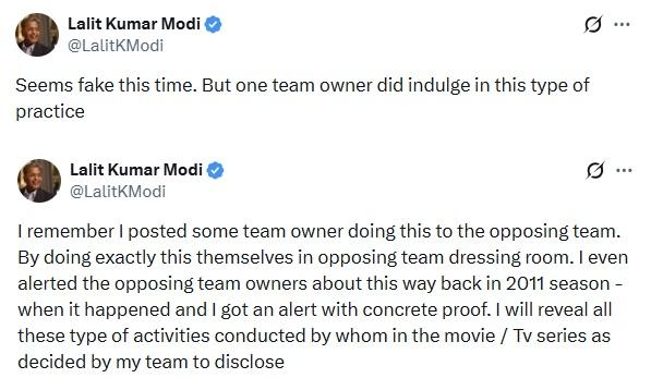 उन्होंने आगे कहा कि उन्हें याद है, उन्होंने एक पोस्ट किया था, जिसमें एक टीम का मालिक विरोधी टीम के साथ ऐसा कर रहा था.वे खुद विरोधी टीम के ड्रेसिंग रूम में जाकर ठीक यही काम कर रहे थे. उन्होंने आगे लिखा कि उन्होंने 2011 सीजन में ही विरोधी टीम के मालिकों को इस बारे में आगाह कर दिया था.जब यह घटना हुई थी और उन्हें पक्के सबूतों के साथ इसकी जानकारी मिली थी.उनकी टीम ने जैसा तय किया है, उसके अनुसार वह उस फ़िल्म या टीवी सीरीज में यह खुलासा करेंगे कि इस तरह की सारी हरकतें किसने की थीं.