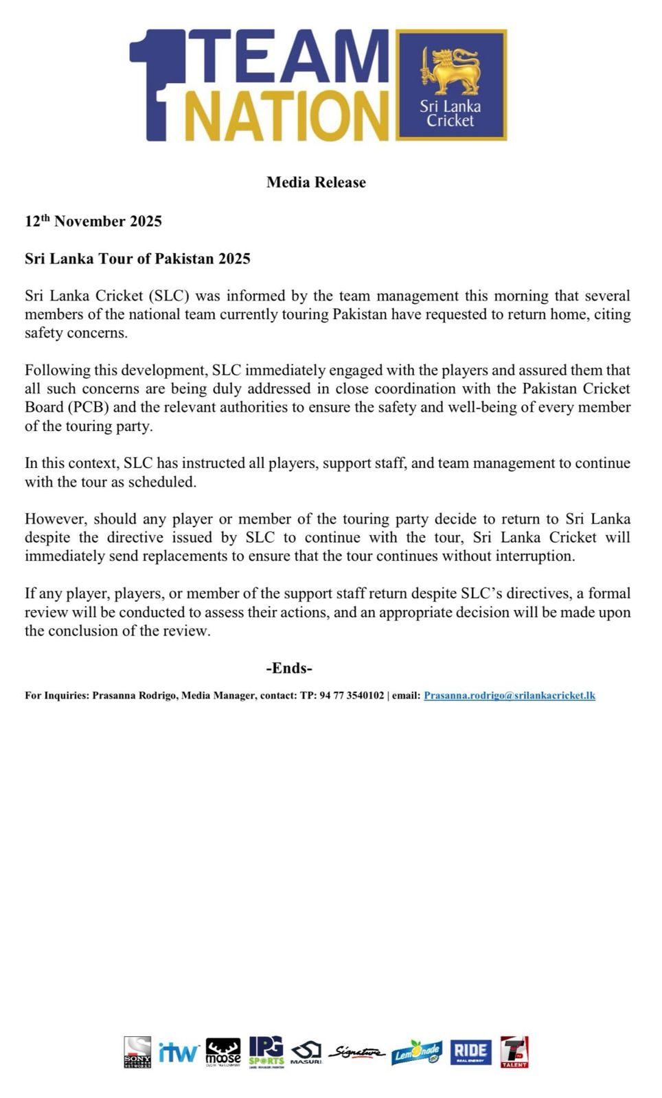 श्रीलंका क्रिकेट (SLC) ने खिलाड़ियों और सहयोगी स्टाफ को सुरक्षा चिंताओं के चलते मौजूदा पाकिस्तान दौरे को छोड़ने पर 'औपचारिक समीक्षा' की धमकी दी है. एसएलसी ने कहा कि बोर्ड ने खिलाड़ियों की सुरक्षा का आश्वासन दिया है और टीम को तय शेड्यूल के अनुसार मैच खेलने का ऑर्डर दिया है. बोर्ड ने दौरे पर गई टीम के किसी भी सदस्य के लिए परिणाम भी तय किए हैं जो उनके निर्देशों का उल्लंघन करता है.