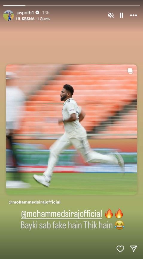 india vs west indies: भारत ने बीते दिन वेस्ट इंडीज को अहमदाबाद टेस्ट में ढाई दिन में पारी और 140 रन से हरा दिया. इसी के साथ दो मैचों की टेस्ट सीरीज में 1-0 से बढ़त भी हासिल कर ली. भारत ने इस मुकाबले में तीन शतक लगाए. वहीं मोहम्मद सिराज, जसप्रीत बुमराह और रवींद्र जडेजा ने विकेटों की बारिश कर दी. भारत की शानदार जीत के बाद बुमराह ने सिराज के लिए सोशल मीडिया पर एक पोस्ट किया, जो वायरल हो गया. उन्होंने सिराज के रन अप की तस्वीर शेयर की और आग वाली इमोजी के साथ सिराज को टैग करते हुए लिखा कि बाकी सब फेक हैं, ठीक है.
